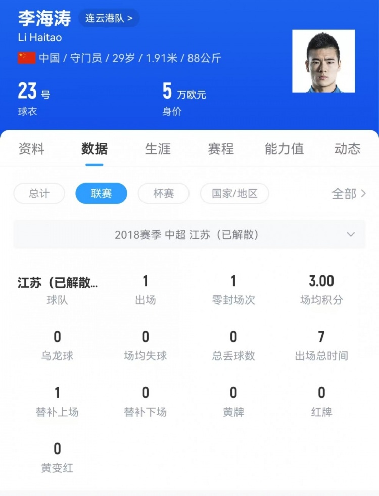 李海涛生涯仅代表江苏队出场1次,替补登场仅7分钟。